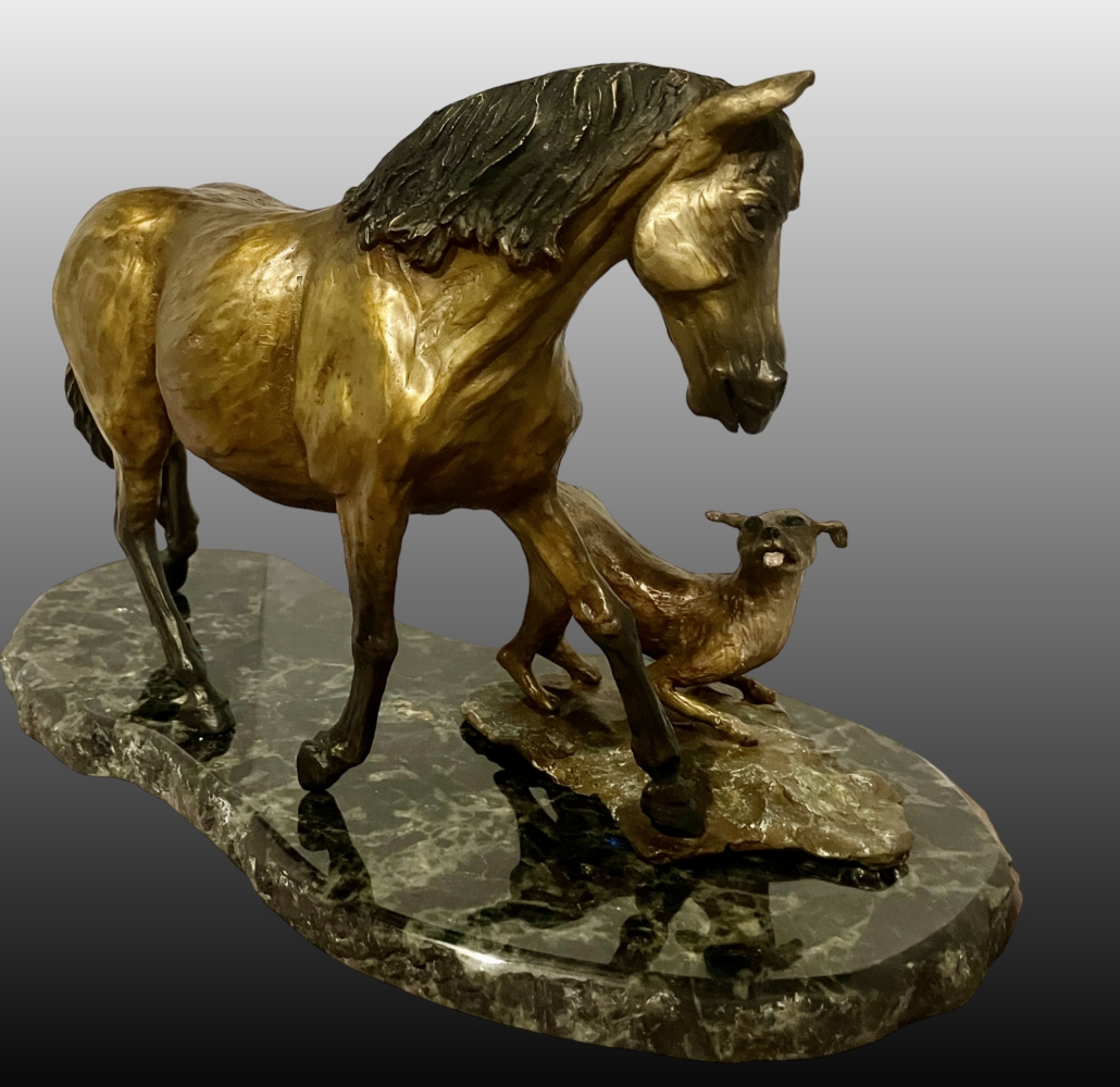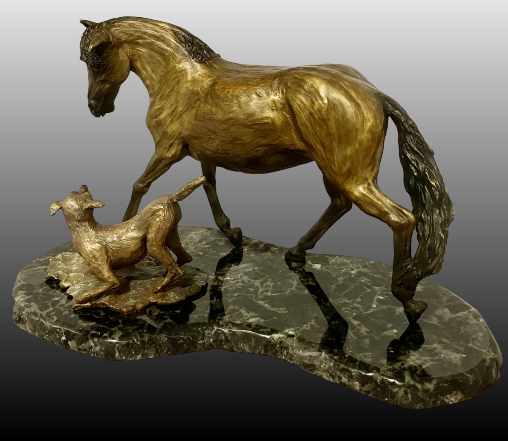 Horses and dogs just go together! This friendly pair of friends are having a romp out on the ranch as the beautiful horse trots around the playful dog. Enjoy this playful pair of buddies cast in bronze on granite base.
